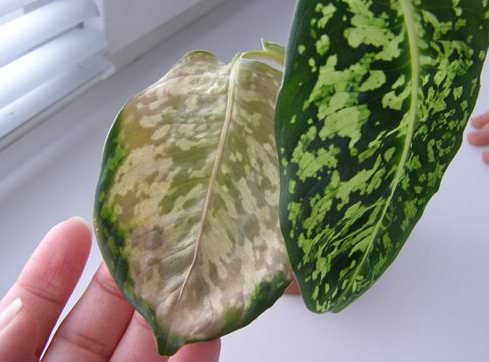 Дифенбахія жовтіє У першу чергу в таких випадках підозра падає на порушення температурного режиму: або в приміщенні занадто холодно, або рослина стояла на протязі. Можливою причиною є також поливання рослини занадто жорсткою водою або нестача поживних речовин у ґрунті.